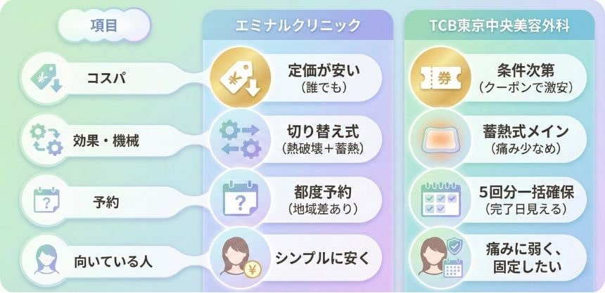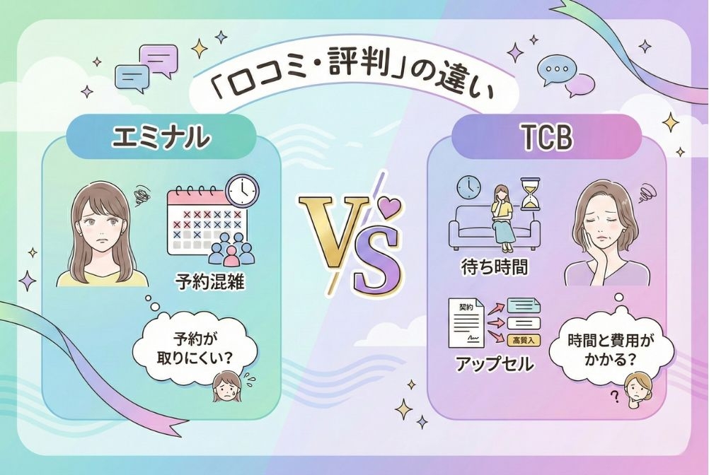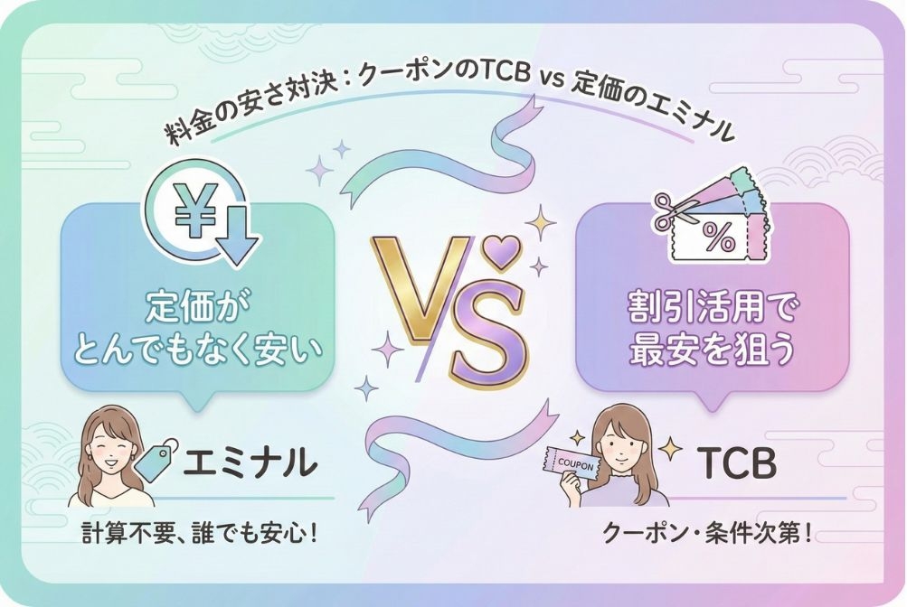エミナルは「追加料金なしの明朗会計」、TCBは「予約保証とクーポンの爆発力」が特徴です。