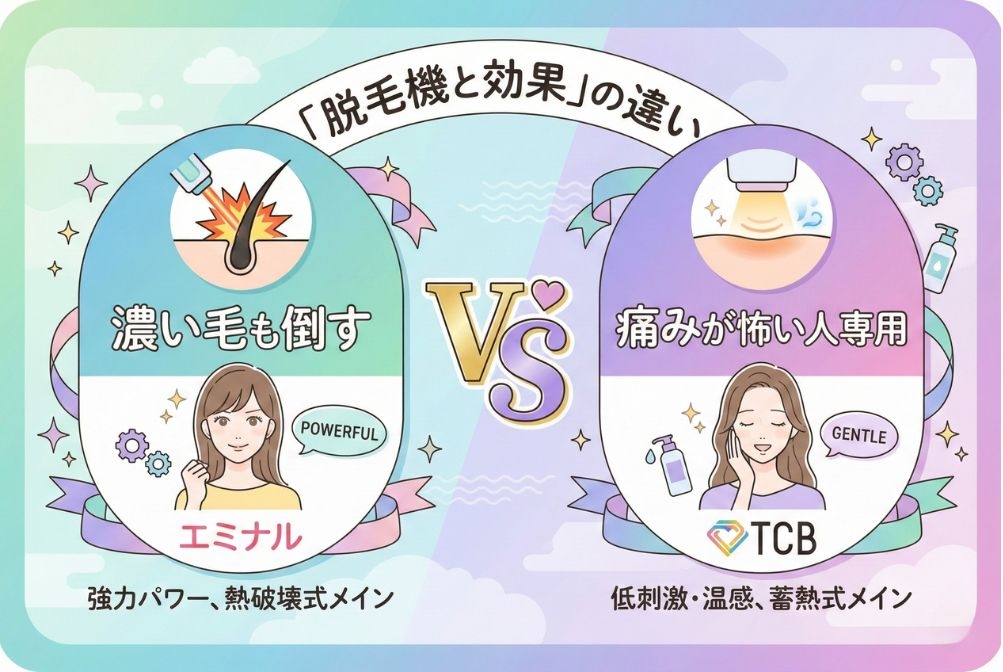 エミナルは、1台で「濃い毛にガツンと効く熱破壊式」と「痛みを抑えた蓄熱式」を切り替えられる【クリスタルプロ】を使用しています。