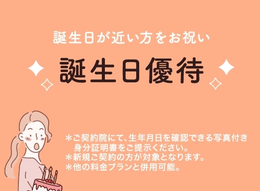 誕生日特典(脱毛)![]() ![]() | 最大30,000円OFF | 誕生月とその前後1ヶ月に来院する方 |