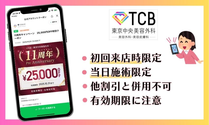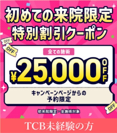 25,000円OFFクーポン![]() ![]() | 全施術対象で25,000円割引 | TCBに初めて来院する方限定 |