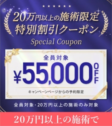 55,000円OFFクーポン![]() ![]() | 全施術対象で55,000円割引 | 20万円以上の施術を契約する方 |