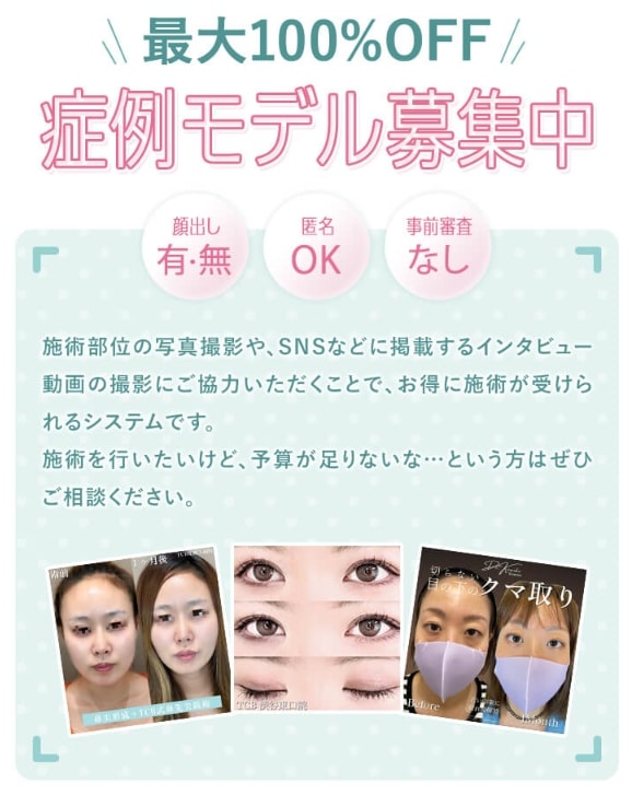 症例モデル割引![]() ![]() | 最大100%OFF(施術により異なる) | 施術部位の写真・動画提供に協力できる方 |