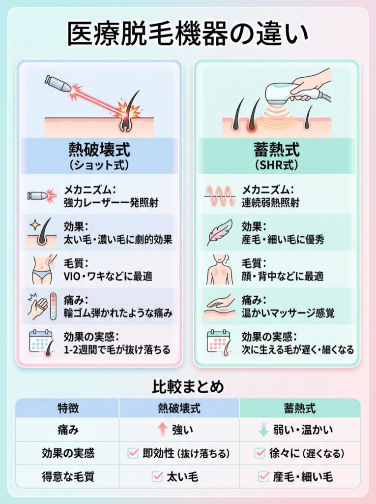 医療脱毛の機械には、大きく分けて「熱破壊式」と「蓄熱式」の2種類があり、得意な毛質が異なります。