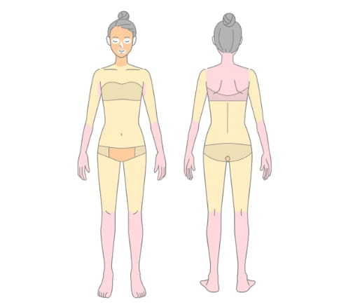 | ピンク | うなじ、背中、腰、両脇、両ひじ下、両手指甲、両ひざ下、両足指甲 |