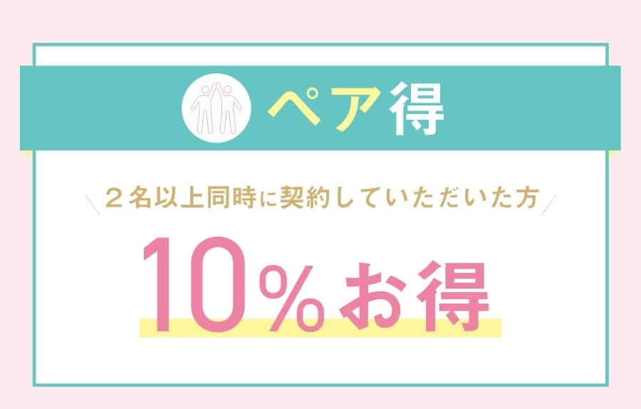 お友達やカップルなど男女問わず、2人以上で医療脱毛を検討中ならペア割利用がマスト!学割同様にコース料金から10%オフ・最大35,000円割引となります。