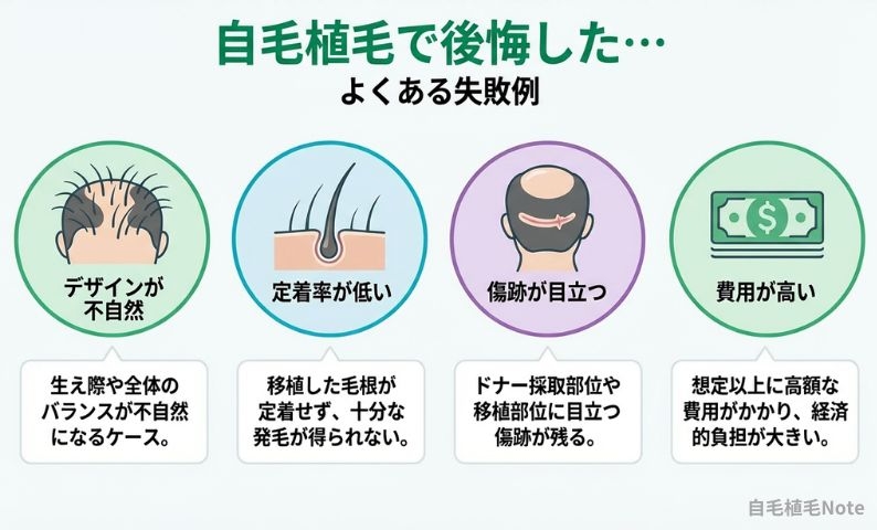 自毛植毛は万能ではありません。高額な費用、痛み、不自然な仕上がり、医師の技術差――知らずに受けると後悔することも。