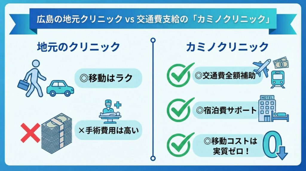 カミノクリニックは、「広島で相談して、大阪・福岡で手術する」ことで、費用を極限まで抑えられる、広島ユーザーの賢い選択肢です。