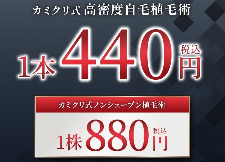 | 術式 | FUE/切らない植毛 ・カミクリ式高密度自毛植毛術 440円/株 ・カミクリ式ノンシェーブン植毛(刈り上げ不要) 880円/株 ※毛髪を太く強くするHCE(毛母細胞培養上清液)併用 |