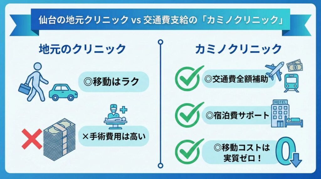 この記事では、仙台エリアで無料相談ができ、手術は「旅費0円」で安く受けるための賢い方法と、具体的な料金シミュレーションを紹介します。